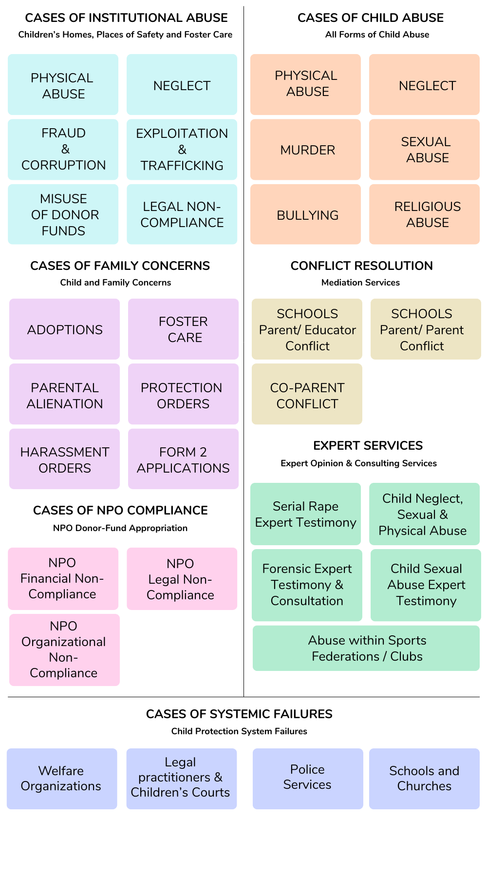 We serve both external clients—desperate families seeking answers and justice—and professional organizations, including welfare, police, legal sector and other government and non-government bodies, that are committed to identifying and remedying their internal failures.